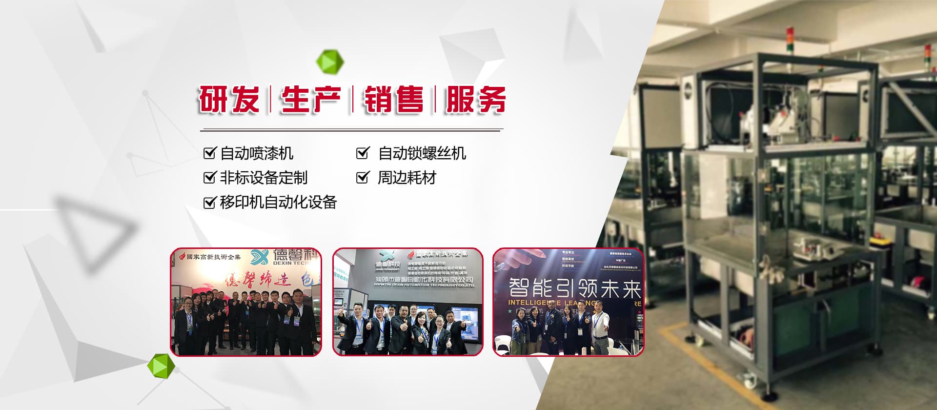 德馨科技創(chuàng)立以來,以改變噴印業(yè)傳統(tǒng)手工生產(chǎn)模式為目標(biāo),產(chǎn)品開發(fā)制造堅(jiān)持以“環(huán)保、智能”為理念,為企業(yè)的生產(chǎn)環(huán)境、人力成本、生產(chǎn)效率等提供更為優(yōu)良的服務(wù)和技術(shù)支持。公司研發(fā)產(chǎn)品主要有自動(dòng)化噴漆機(jī)械、噴漆模具制作等;生產(chǎn)銷售移印機(jī)械及移印相關(guān)耗材,包括菲林設(shè)計(jì)輸出;鋼板制作、移印膠頭制作、定位制作及周邊配件耗材并提供完善的售后服務(wù)支持。
